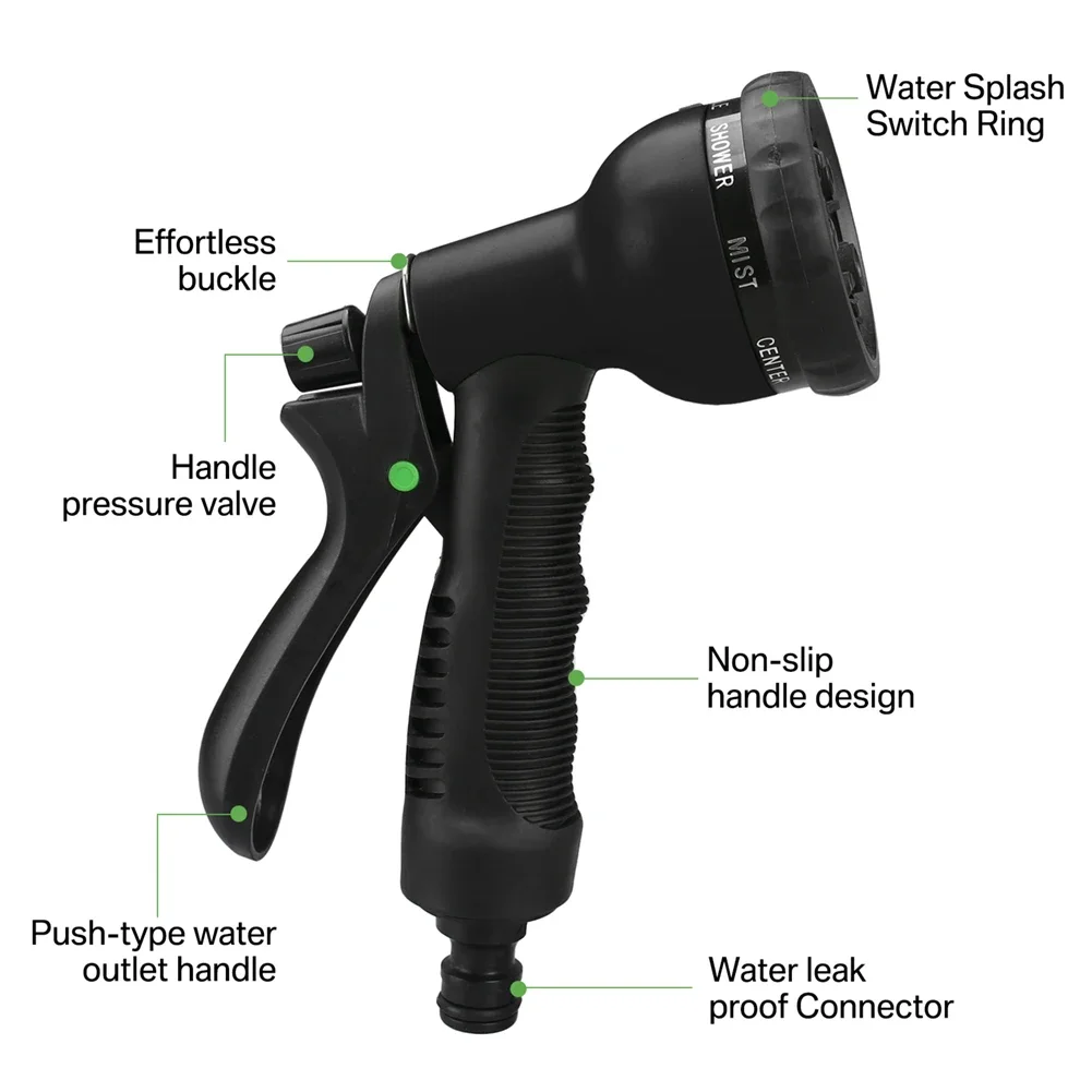 Spray nozzle can be rotated for 8 pattern output water: CONE, SOAKER, FULL, ANGLE, SHOWER, MIST, CENTER, FLAT.